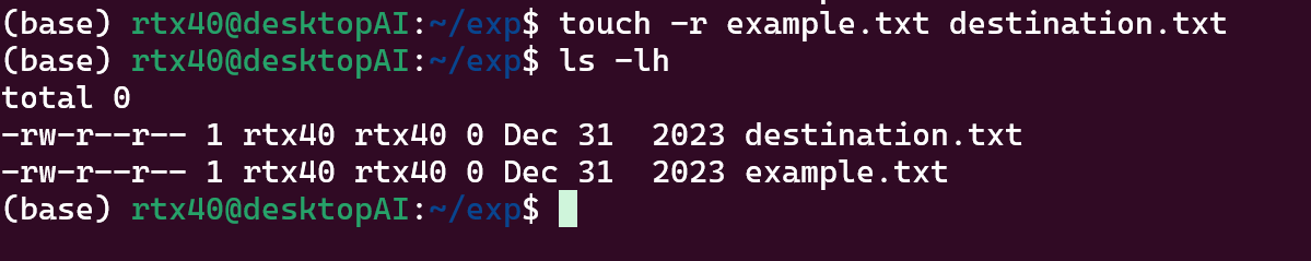 他のファイルと同じタイムスタンプを別のファイルに適用したい場合、-rオプションを使います。このオプションを使用すると、あるファイルのタイムスタンプを別のファイルに簡単にコピーできます。