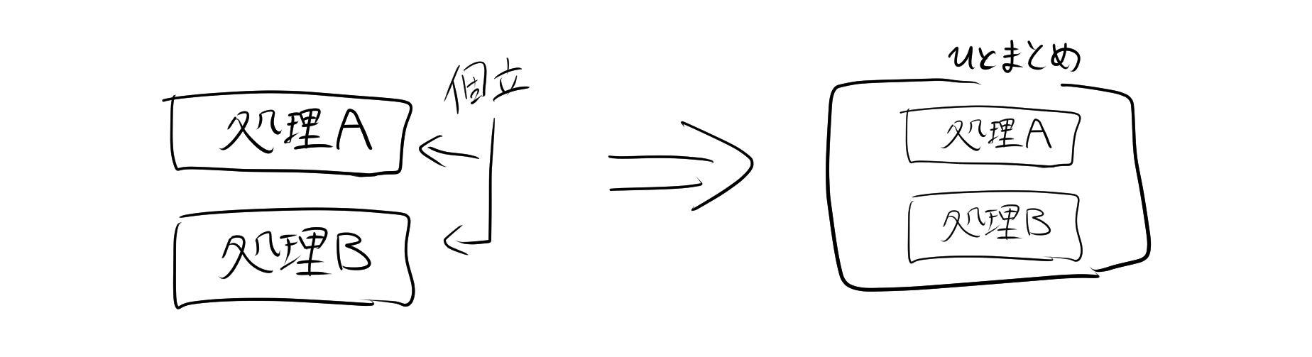 この2つの操作はセットで行われる必要があります。もし、途中でエラーが起きてAさんの口座からお金が引き出されたけれど、Bさんの口座に振り込まれなかったら、大問題です。