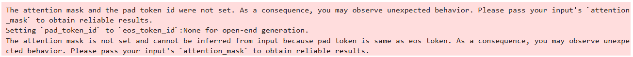 The attention mask and the pad token id were not set. As a consequence, you may observe unexpected behavior. Please pass your input’s attention_mask to obtain reliable results.