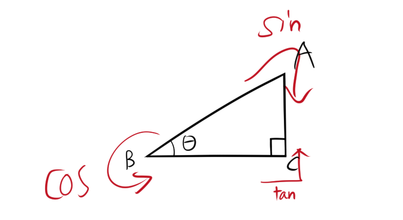 \[ \begin{align*} \sin \theta &= \dfrac{AC}{AB} \\ \cos \theta &= \dfrac{BC}{AB} \\ \tan \theta &= \dfrac{AC}{BC} \end{align*} \]