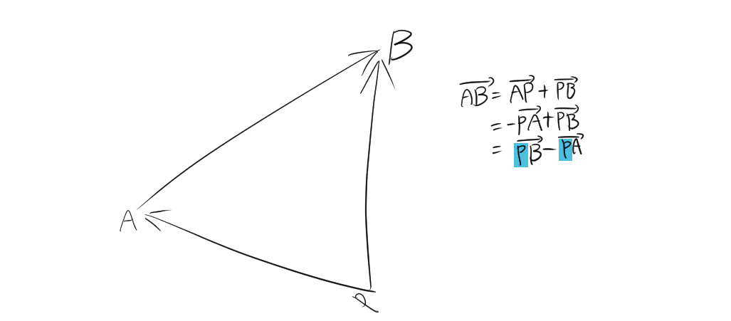 \[ \begin{aligned} \overrightarrow{AB} &= \overrightarrow{AP} + \overrightarrow{PB} \\ &= -\overrightarrow{PA} + \overrightarrow{PB} \\ &= \overrightarrow{PB} - \overrightarrow{PA} \end{aligned} \]